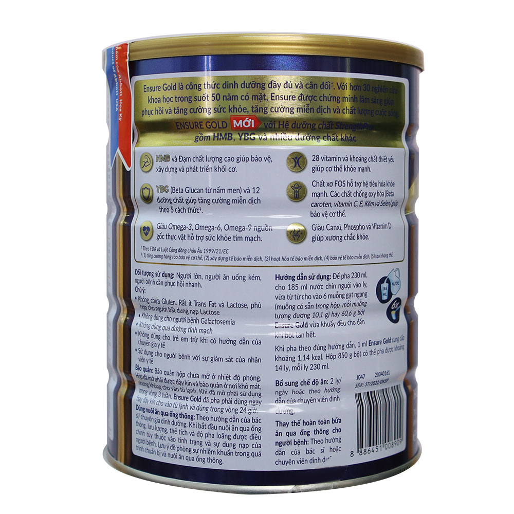 Khi pha đúng theo hướng dẫn, 1ml Ensure Gold cung cấp khoảng 1Kcal. Hộp 850g bột có thể pha được khoảng 16 ly mỗi ly 230ml.